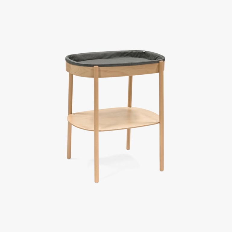 Med sitt tidløse, ovale design gjenspeiler stellebordet formen til Sleepi-sengene. Det gir god plass til føttene under bordet, slik at du kan stå nær barnet under stell. Med mulighet for stell fra både kortsiden og langsiden er det enkelt å tilpasse bordet til rommets innredning.