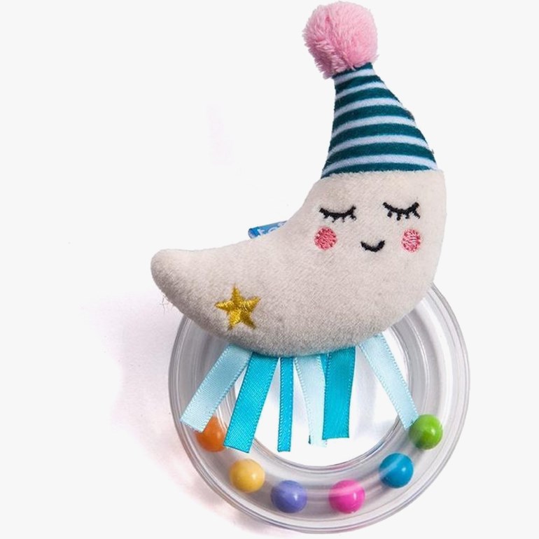 En fargerik babyrangle som er lett å gripe tak i, både rundt ringen og i månefiguren. Kulene i ringen sørger for en koselig raslelyd når den ristes på, og er også spennende å se på i seg selv. Lek med rangle bidrar til utviklingen av både sinnet og finmotorikken.