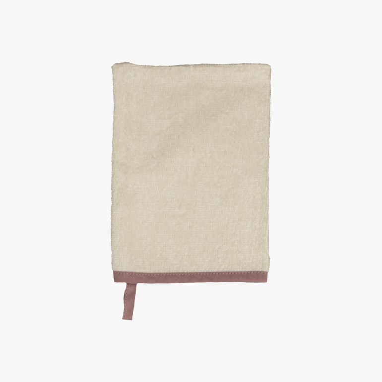Enkel, hvit vaskevott i bomull. Votten har farget kant og hempe i enden, slik at den enkelt henges opp til tørk etter vask.