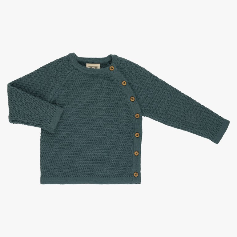 Myk og komfortabel genser i 100 prosent høykvalitets merinoull. Strikket i mønster med god passform. Knapper på siden som gjør det enkel å ta på babyen. Kan vaskes på 30 grader ullprogram. Oeko-Tex