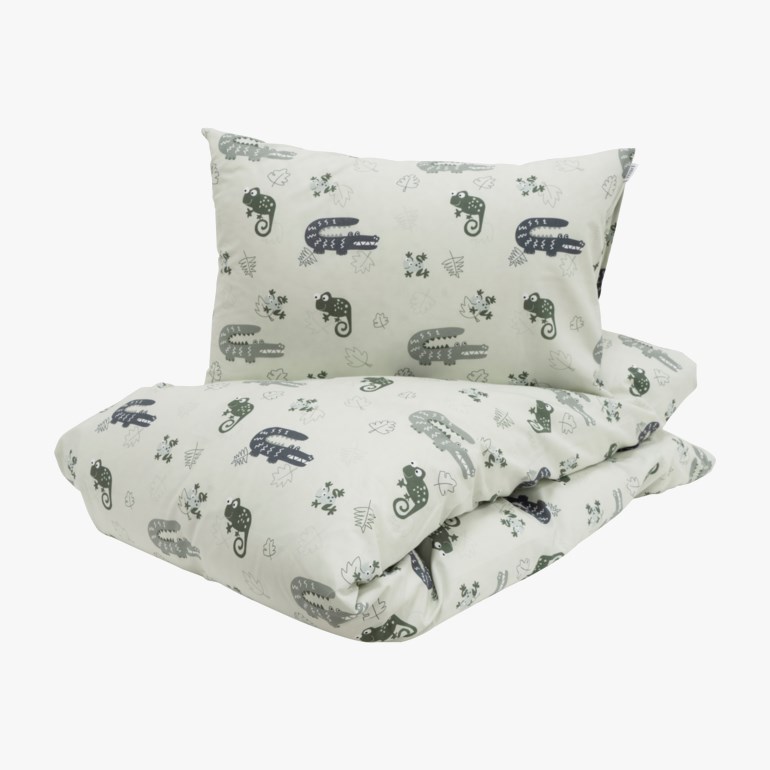 Sengesett i 100 % myk og deilig bomull. Sengetøyet er dekorert med kult trykk av krokodiller og firfisler, med blader i bakgrunnen.