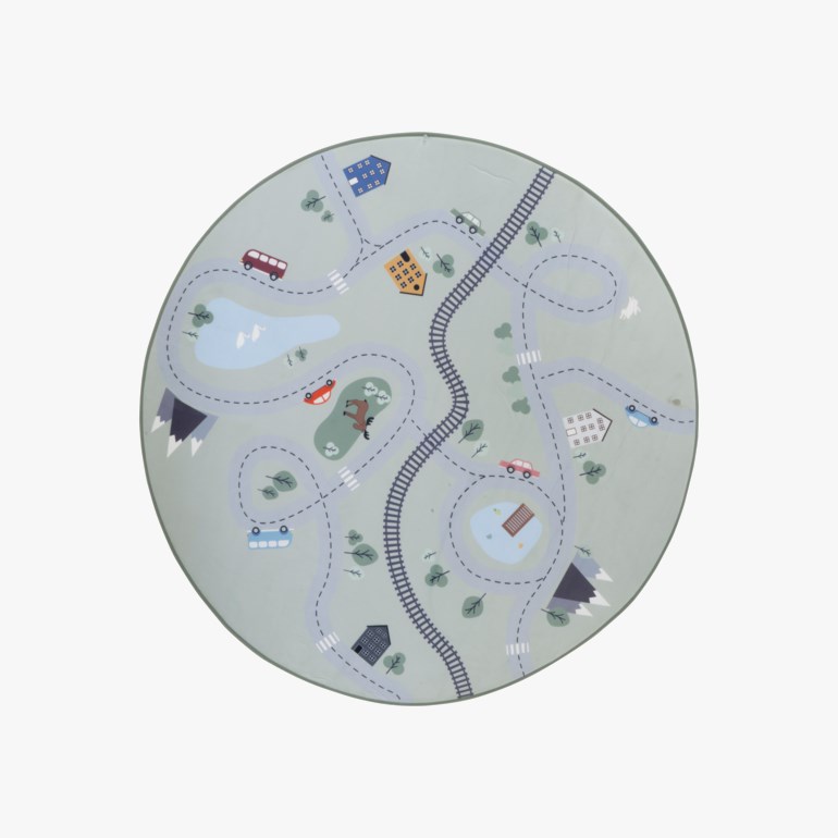 Gulvteppe i 100 % polyester, dekorert med bilveier og togbaner som kan brukes i lek. Baksiden av teppet har antiskli, slik at det sitter godt på gulvet. Perfekt som både leketeppe og gulvteppe på barnerommet.