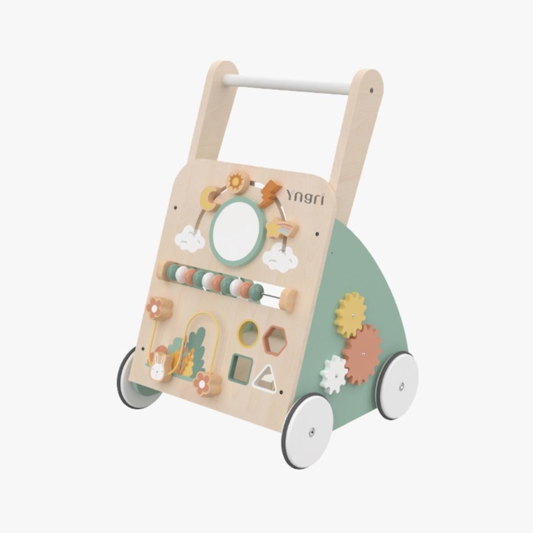 Yngri lær-å-gå-vogn i tre gir barnet støtte til å ta sine første steg på en trygg og morsom måte. Den solide konstruksjonen gjør at vognen fungerer som en stabil støtte, samtidig som aktivitetslekene på fronten engasjerer barnet. Her finner de blant annet tregir, kuler, speil, formsorterer og oppbevaringsplass bak – noe som gir mange timers lek og læring.