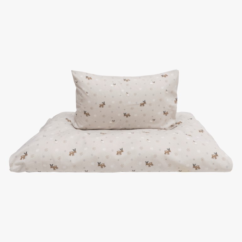Fargerikt sengesett i myk og deilig bomullsflanell. Dekorert med reinsdyr og snøflak - perfekt til jul!