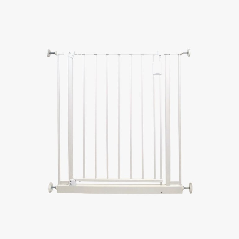 Sperr av døråpninger på sekunder uten verktøy. Y5 Universalgrind monteres med trykkfeste og åpnes enkelt med én hånd av voksne. Grinden dekker 72–79 cm som standard, og kan forlenges til inntil 129 cm med forlengere (selges separat) – én på hver side. Stabil stålramme og monteringskopper gir sikker avsperring i hverdagen.